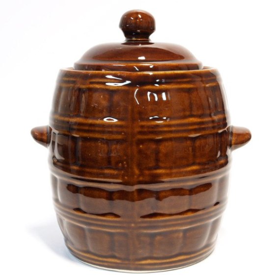 Kamionkowy garnek w kształcie beczki do kiszenia, z pokrywą i kołnierzem