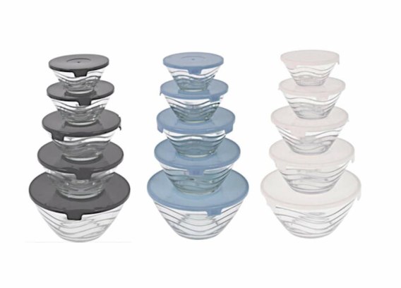 Komplet 5 szklanych misek z pokrywami plastikowymi o różnych pojemnościach.