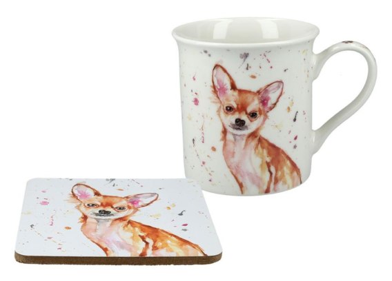 Kubek z podkładką z kolekcji Leonardo England, wykonany z najwyższej jakości porcelany, zdobiony wizerunkiem psa Chiuahua.