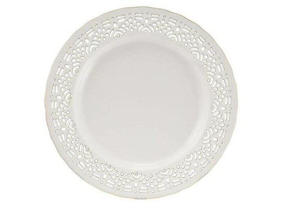 Talerz deserowy z kolekcji Clara Gold Ivory, marki Villa Italia. Niezwykle elegancki i ponadczasowy, charakteryzuje się wyjątkowym kształtem i pięknymi detalami; misterną, ręcznie wykonana koronką i złotym zdobieniem na obrzeżu.
