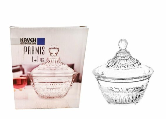 Szklana cukiernica z pokrywką z serii Parmis.