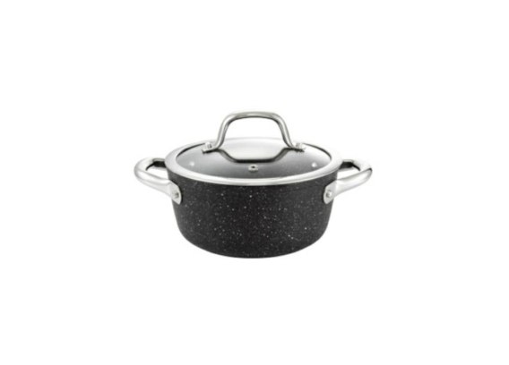 Luksusowy garnek z wysokiej jakości powłoką antyadhezyją, umożliwiającą stosowanie metalowych akcesoriów kuchennych. Potrawy przygotowywane na powierzchni imitującej nieoszlifowany, naturalny kamień nie przypalają się, gotowanie jest szybkie i równomierne. Posiada masywną, wykonaną ze szkła oraz stali nierdzewnej pokrywkę z otworem na parę, wodoszczelne nierdzewne uchwyty oraz dno indukcyjne. Odpowiedni do wszystkich rodzajów kuchenek oraz piekarników (z pokrywką max. 200 °C). Można myć w zmywarce. Gwarancja 5- letnia.