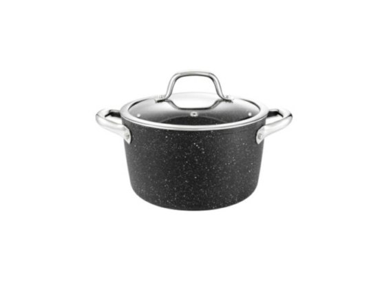 Luksusowy garnek z wysokiej jakości powłoką antyadhezyją, umożliwiającą stosowanie metalowych akcesoriów kuchennych. Potrawy przygotowywane na powierzchni imitującej nieoszlifowany, naturalny kamień nie przypalają się, gotowanie jest szybkie i równomierne. Posiada masywną, wykonaną ze szkła oraz stali nierdzewnej pokrywkę z otworem na parę, wodoszczelne nierdzewne uchwyty oraz dno indukcyjne. Odpowiedni do wszystkich rodzajów kuchenek oraz piekarników (z pokrywką max. 200 °C). Można myć w zmywarce. Gwarancja 5- letnia.
