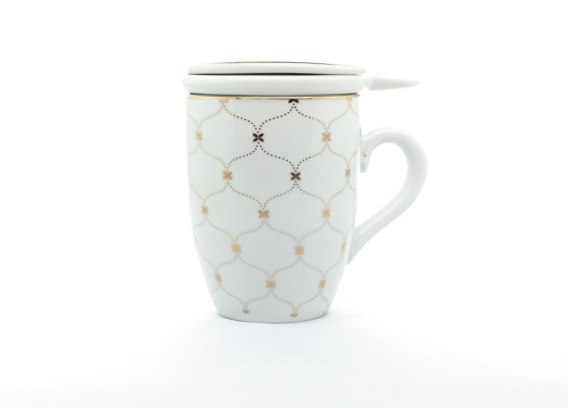 Kubek z zaparzaczem z kolekcji Gemis marki Bogucice, został wykonany z najwyższej jakości porcelany. Kubek została ozdobiony ciekawym wzorem złotej siatki, co nadaje mu wyjątkowego stylu.