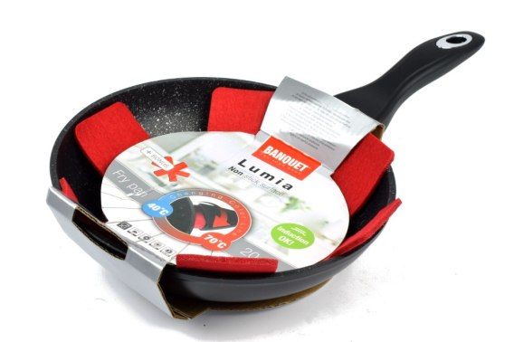 Kuta patelnia aluminiowa LUMIA o wymiarach 20 x 4,3 cm z 3 warstwową powłoką antyadhezyjną. Czarna matowa część zewnętrzna z natryskiem żarowytrzymałym. Patelnia charakteryzuje się nowym elementem technologicznym - krążkiem ochronnym na rękojeśi, który stopniowo z rosnącą temperaturą zmienia kolor z czarnego na czerwony. Zmiana rozpoczyna się przy 40oC i stopniowo kolor czerwony nabiera intensywności do osiągnięcia 70oC, kiedy to patelnia jest w pełni przygotowana do smażenia. Częścią zestawy jest przekładka czerwonego koloru.